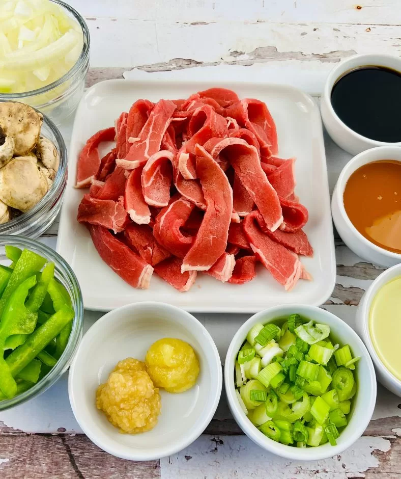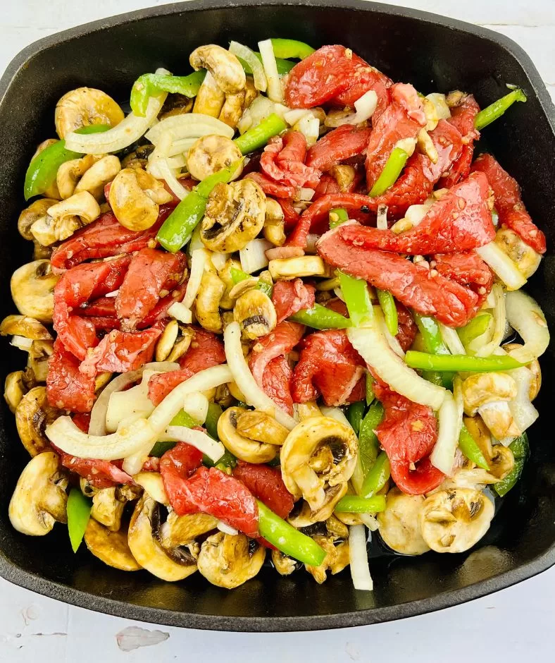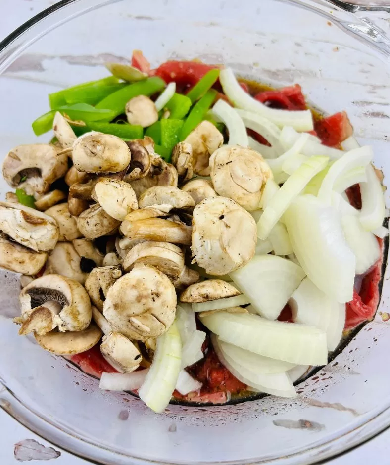 Incorporate the Vegetables: After marinating, stir in the sliced onion, sliced green bell pepper, and sliced mushrooms into the steak and marinade mixture. These vegetables will complement the steak with their textures and flavors.