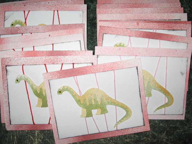 Here were the invites: I used Dinosaur Tracks from my Cricut Cartridge Collection and white card stock. Using my Glimmer Mists, I colored them, layered them and used embroidery floss for contrast and a red self adhesive gem for the eye. I did ask everyone to RSVP so I would have enough Jr Paleontologist kits ready, but had to contact half the people we invited, as they never replied. Maybe I am wrong? RSVP used to mean either way – acceptance or regrets, now it seems optional. (sigh)