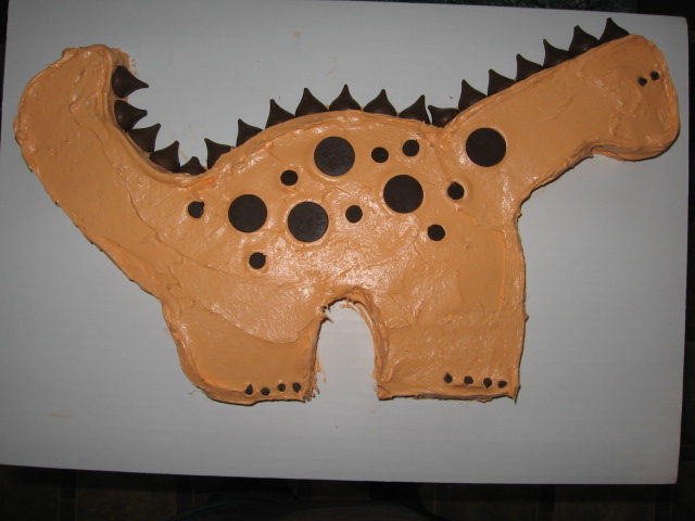 And the BIG dinosaur cake that used Hershey Kisses (Christmas Clearance) for the dorsal spines, chocolate chips and chocolate candy melts for the spots and mini chips for they eyes and toes.