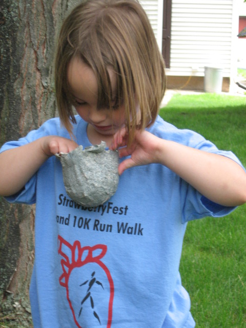 Next, the kids had to steal an egg out of the pterodactyl nest. I told them sneak in and take an egg but to hurry because the mom pterodactyl could be on her way back. For this station I used a green foam wreath at the dollar store, covered it with newspaper and painted it brown and green. We added real leaves and grass to it while the paint was still wet. Then it was placed in a tree.