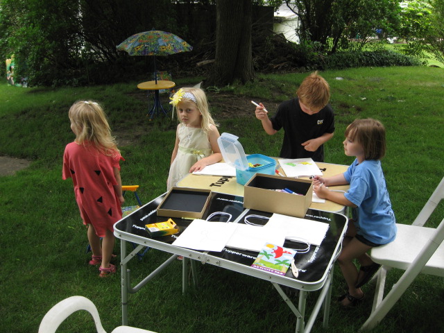 We had white gift bags and a bunch of foam dinosaur stamps. Add a box of markers and crayons and the kiddos could customize their goody bags. Inside of them already was a one inch wide paintbrush (free at Menards with rebate program) and dinosaur activity pad (came 6 to a pack from the dollar store)