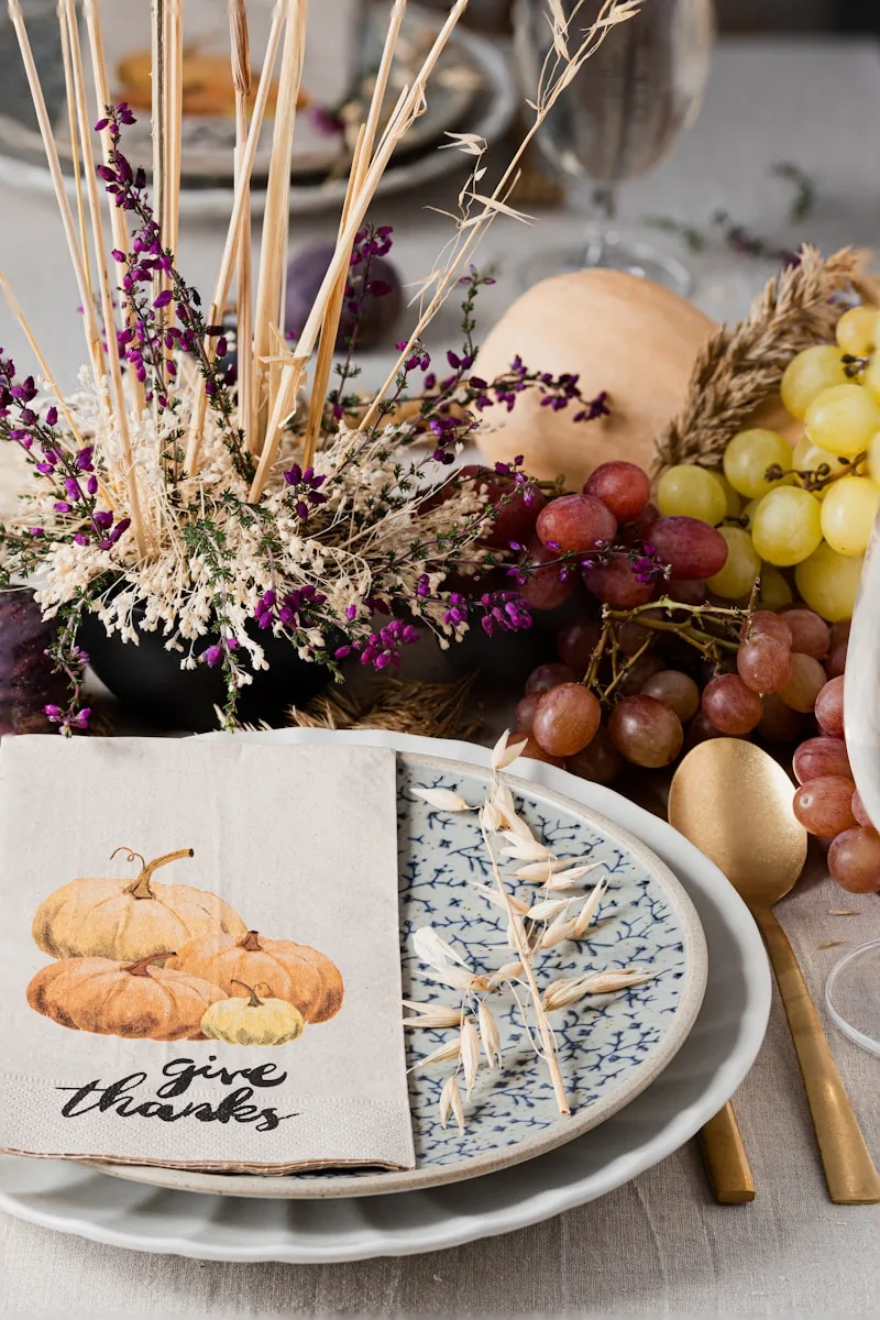 - Centerpiece: Use a centerpiece that ties in with the harvest theme. A pumpkin or a vase filled with fall flowers can work well.