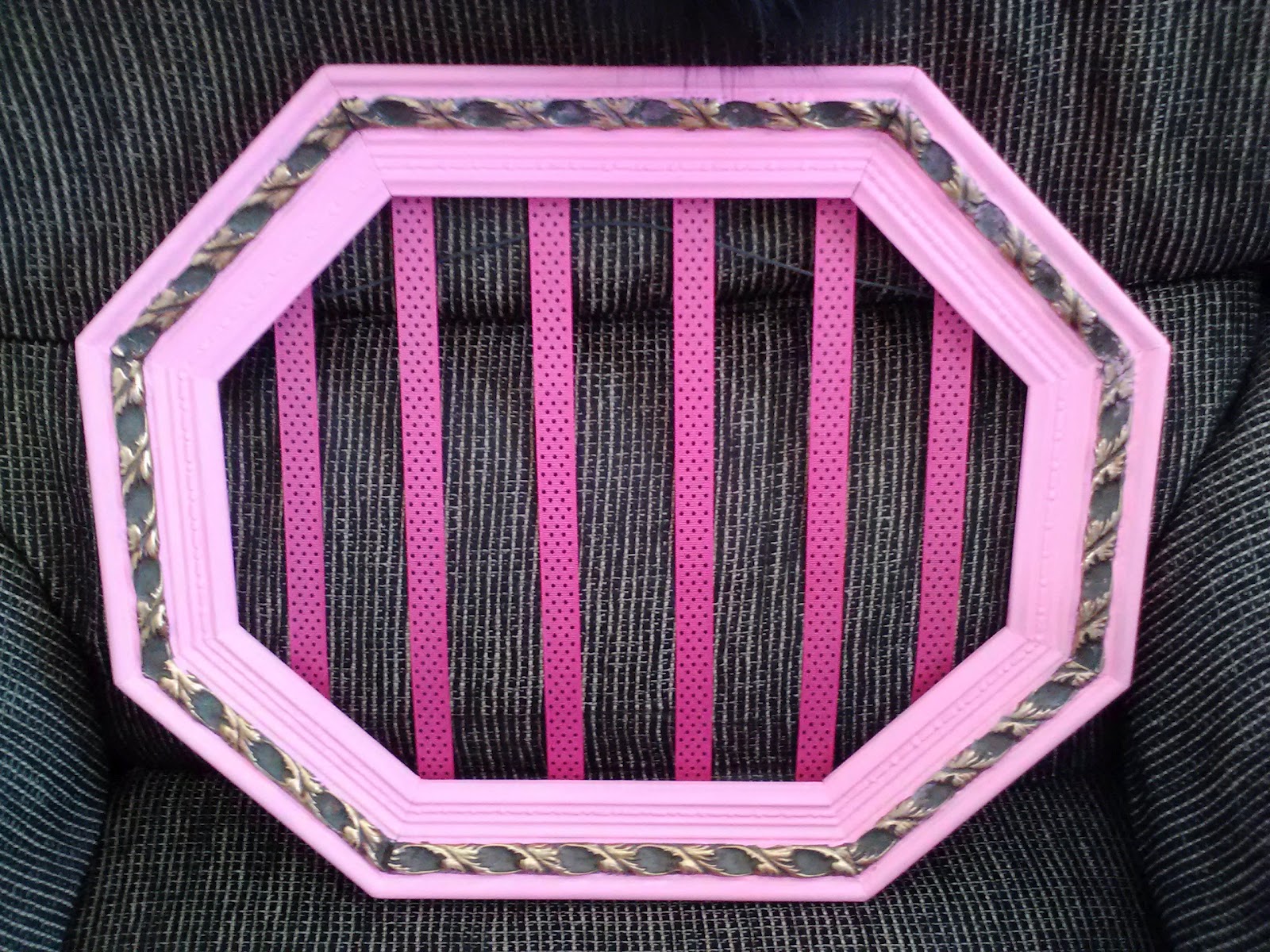 Once your paint is dry, it is time to get out the staple gun! I had a great hot pink ribbon with white polka dots in my stash.