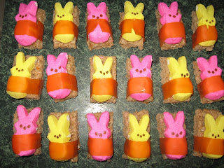 Put a Peep on top and wrap with the “seaweed”. I cut the Fruit by the Foot into 3 equal pieces — the hard part is the end that has the “loop”. It doesn’t un-loop and might split on your peep if you wrap it too tightly. They do “morph” into the cereal bar on the bottom so they stay put nicely.