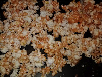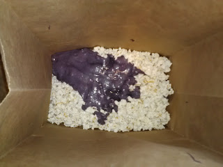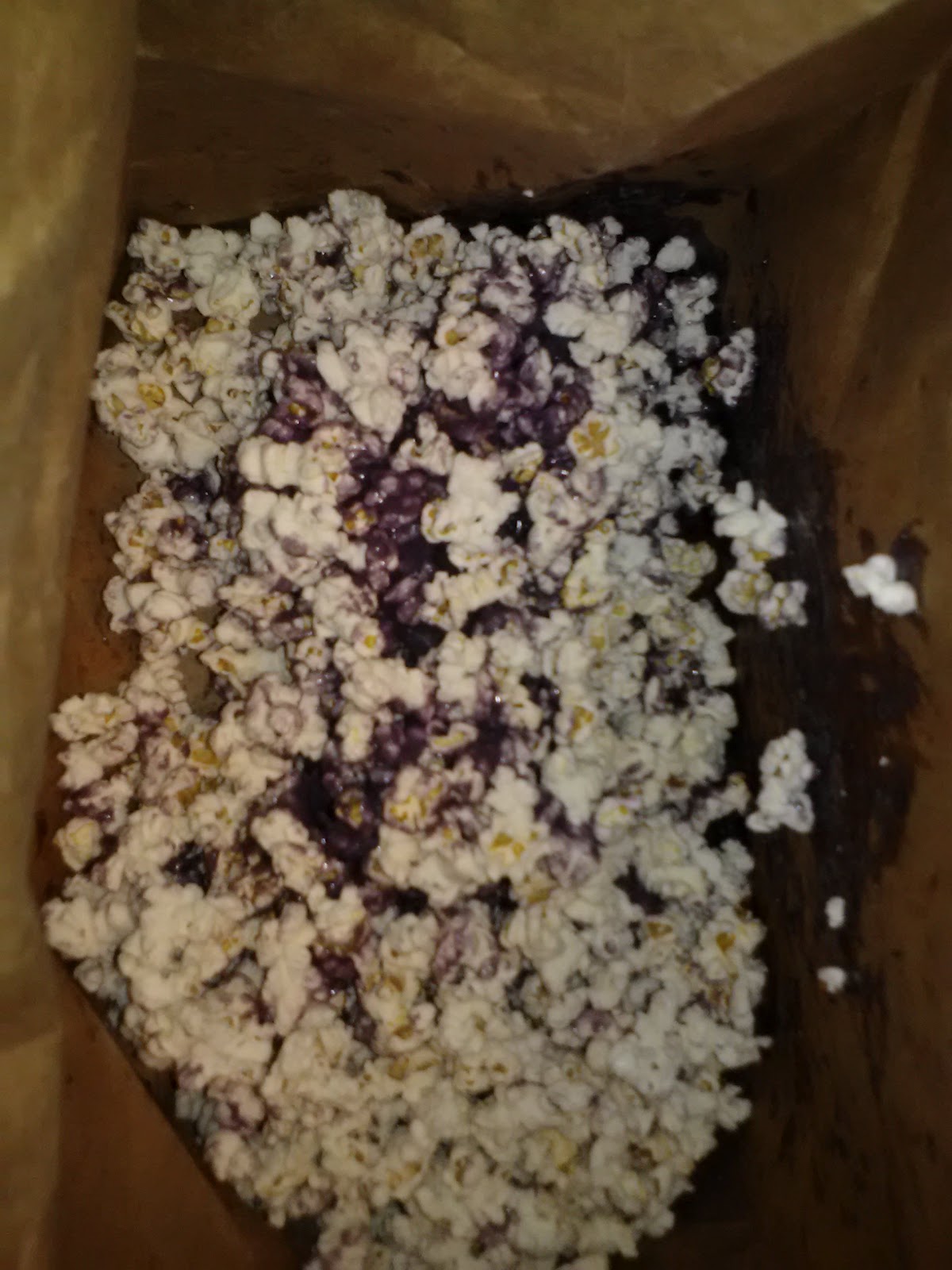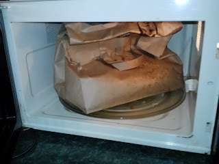 - Now, take a couple batches of popped corn, 16-20 cups worth, in a brown paper bag.